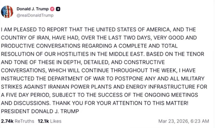 トランプが3月21日に出した、「イランがホルムズ海峡を48時間以内に無条件開放しなければ、発電施設を爆撃する」という通知は、世界中の原油市場や経済を大きく混乱させました。しかし、そのにタイムリミットが迫る23日、彼は以下のような驚くべき声明を出し、攻撃を「一時中止」しています。