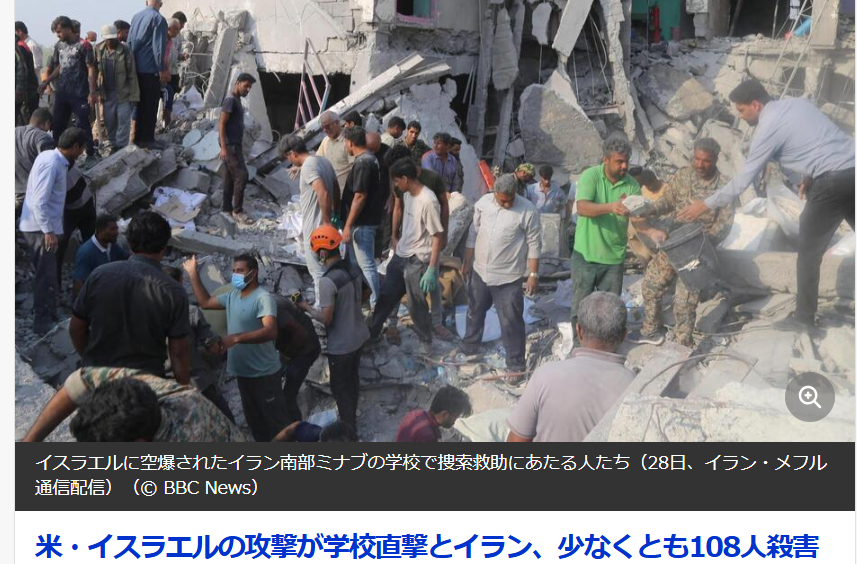 ソレイマニ氏の葬儀には数百万人の市民が駆け付け、国全体が深い喪に服しました(BBChttps://www.bbc.com/japanese/video-51015863)。しかし、彼の死に涙した高齢の最高指導ハメネイ氏も、6年後の今回の攻撃初日に、米中央情報局CIAによって暗殺されてしまう。それだけでなく、イラン南部ホルムズガン州ミナブでは、小学校を空爆し、幼い少女、少なくとも175人を殺害するという残虐な作戦を展開しています。この件では、トランプは、「私は知らない、イラン軍がやった」と関与を否定し、責任転嫁していましたが、その後、米国メディアの調査と、米軍の予備調査によって、空爆はアメリカによるものと結論づけられています(意図的攻撃の可能性大だけど、おそらく最終報告では「誤爆」とされるでしょう)。これらの事件がアメリカに対する不信感や警戒感から、一歩深まって、敵意、復讐心、国家防衛意識の高まりになったことは容易に想像できます。